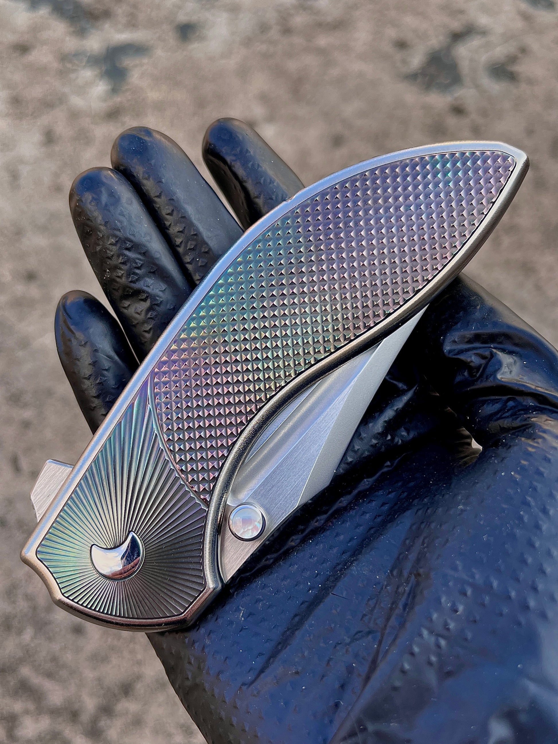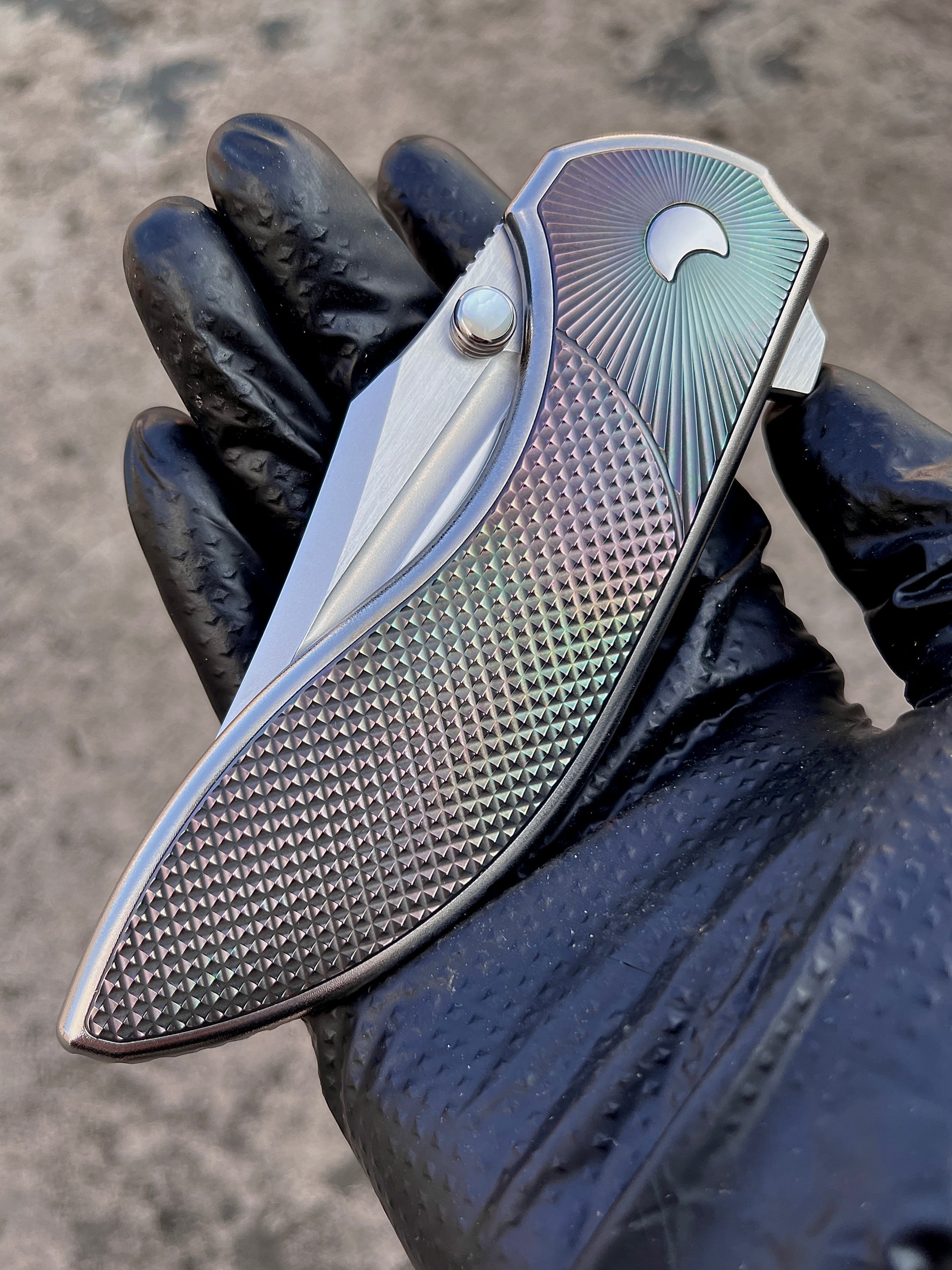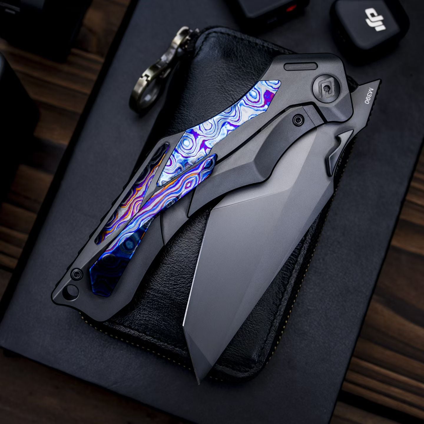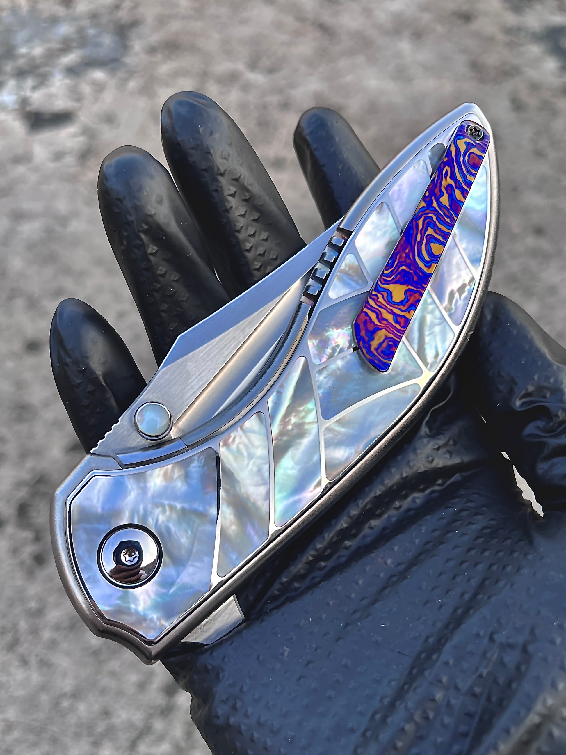 Integral titanium handle inlaid with three materials: zirconium, zirconium Damascus, and deep-sea mother of pearl. M390 blade, overall length 22.5 cm, blade thickness 4 mm.