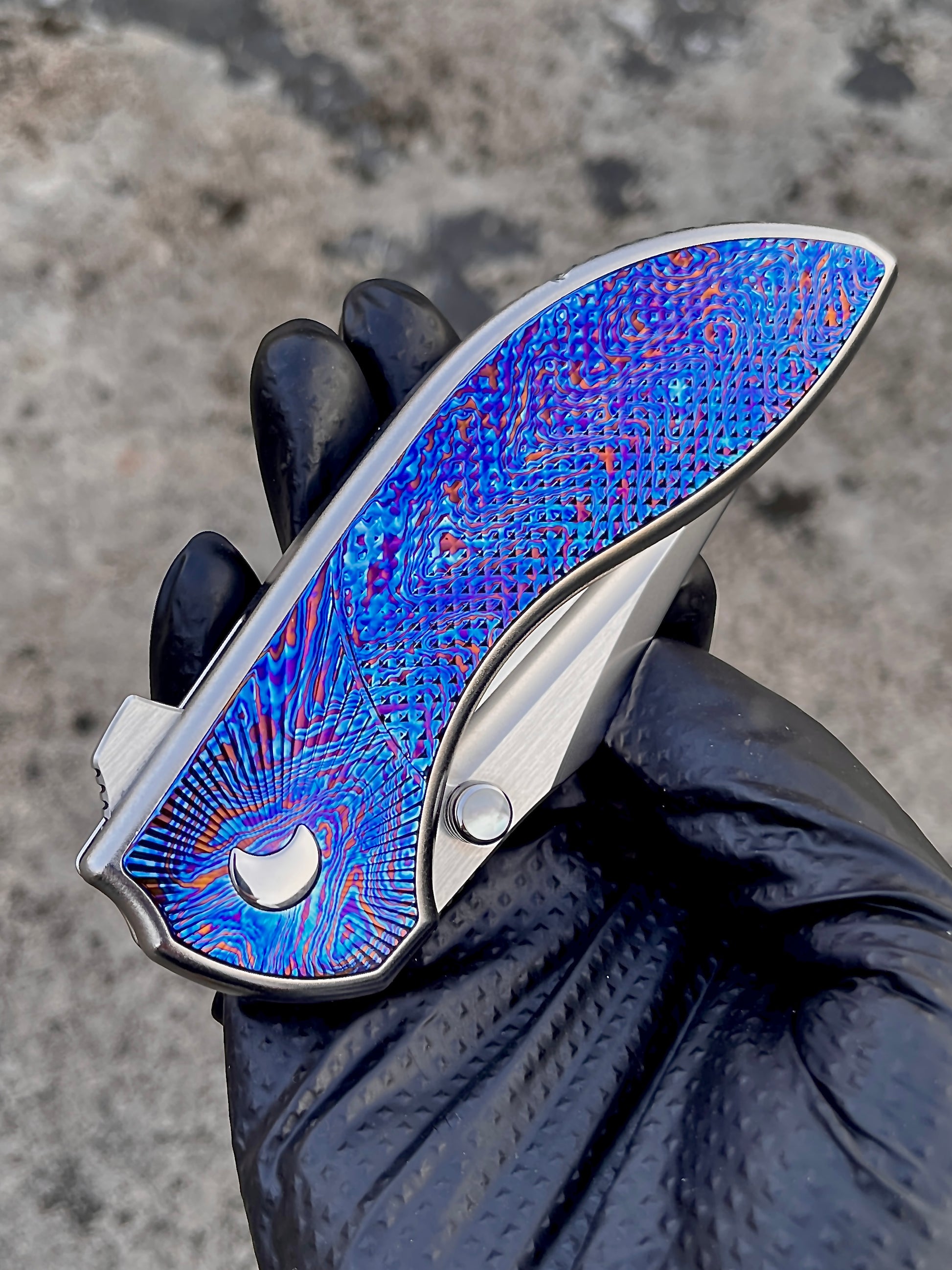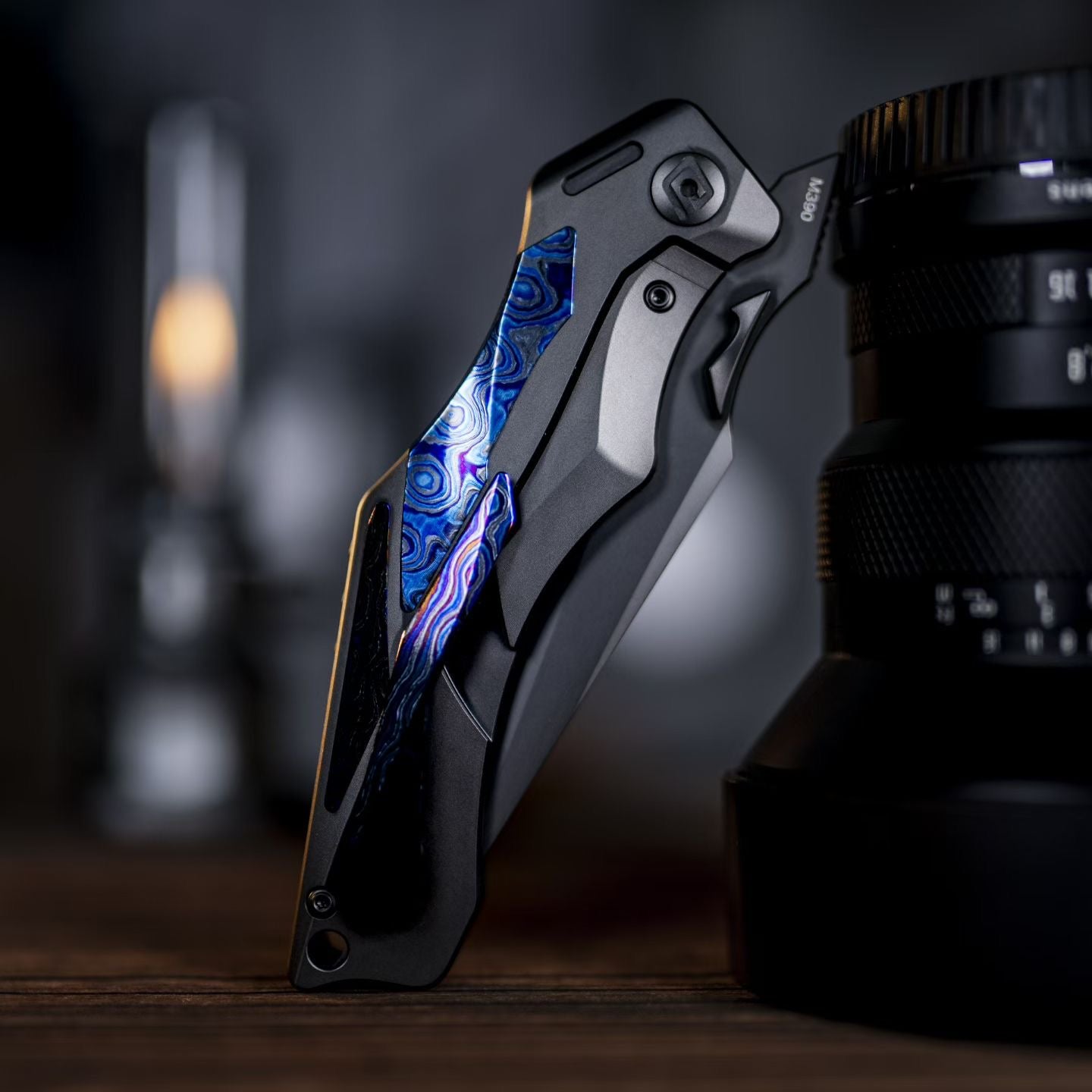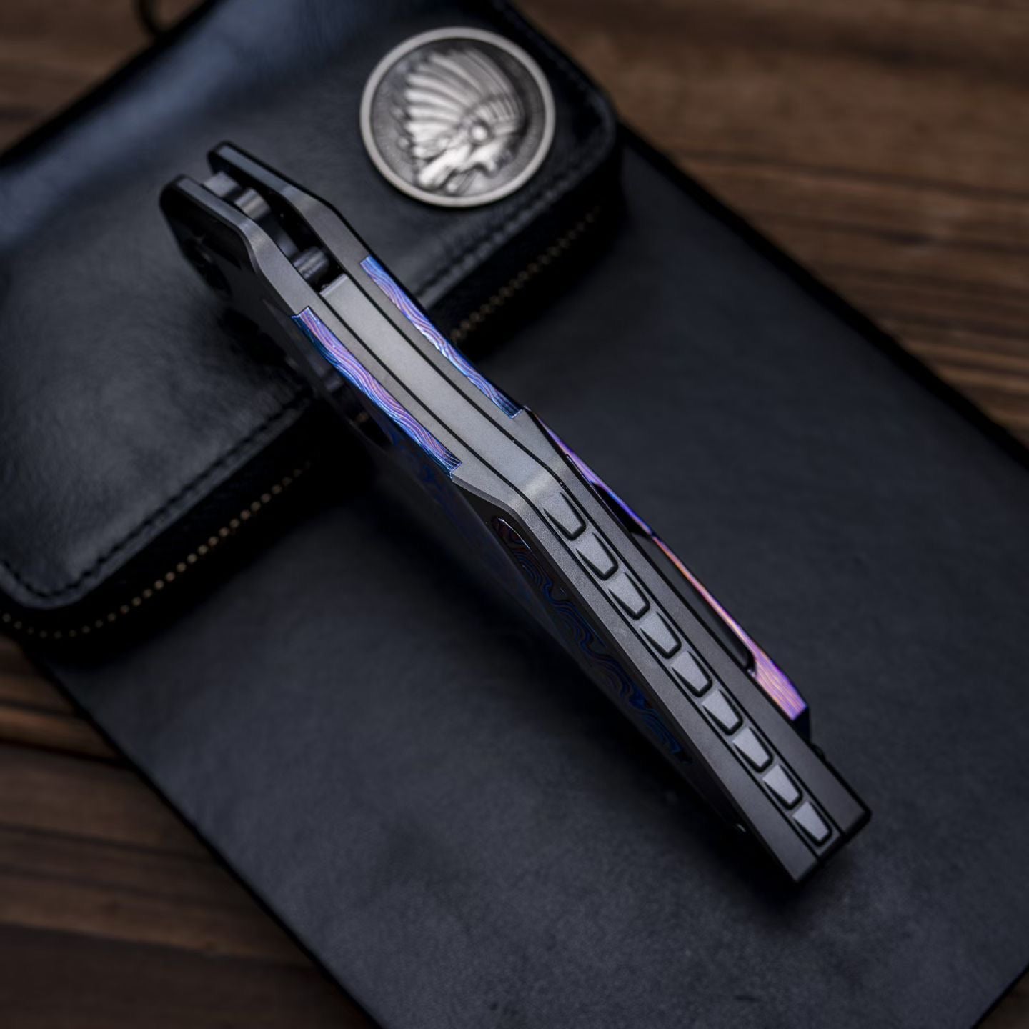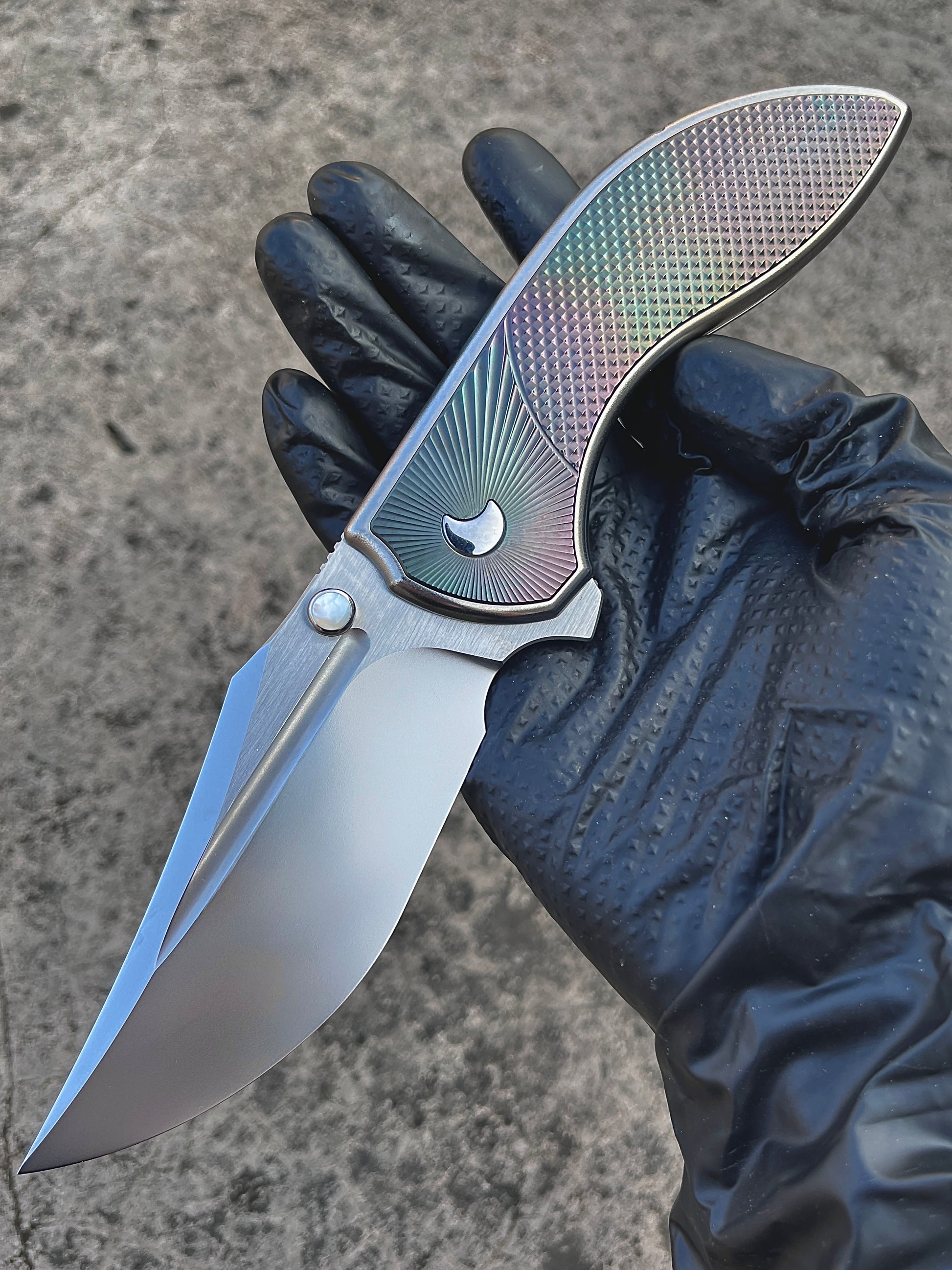 Integral titanium handle inlaid with three materials: zirconium, zirconium Damascus, and deep-sea mother of pearl. M390 blade, overall length 22.5 cm, blade thickness 4 mm.
