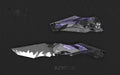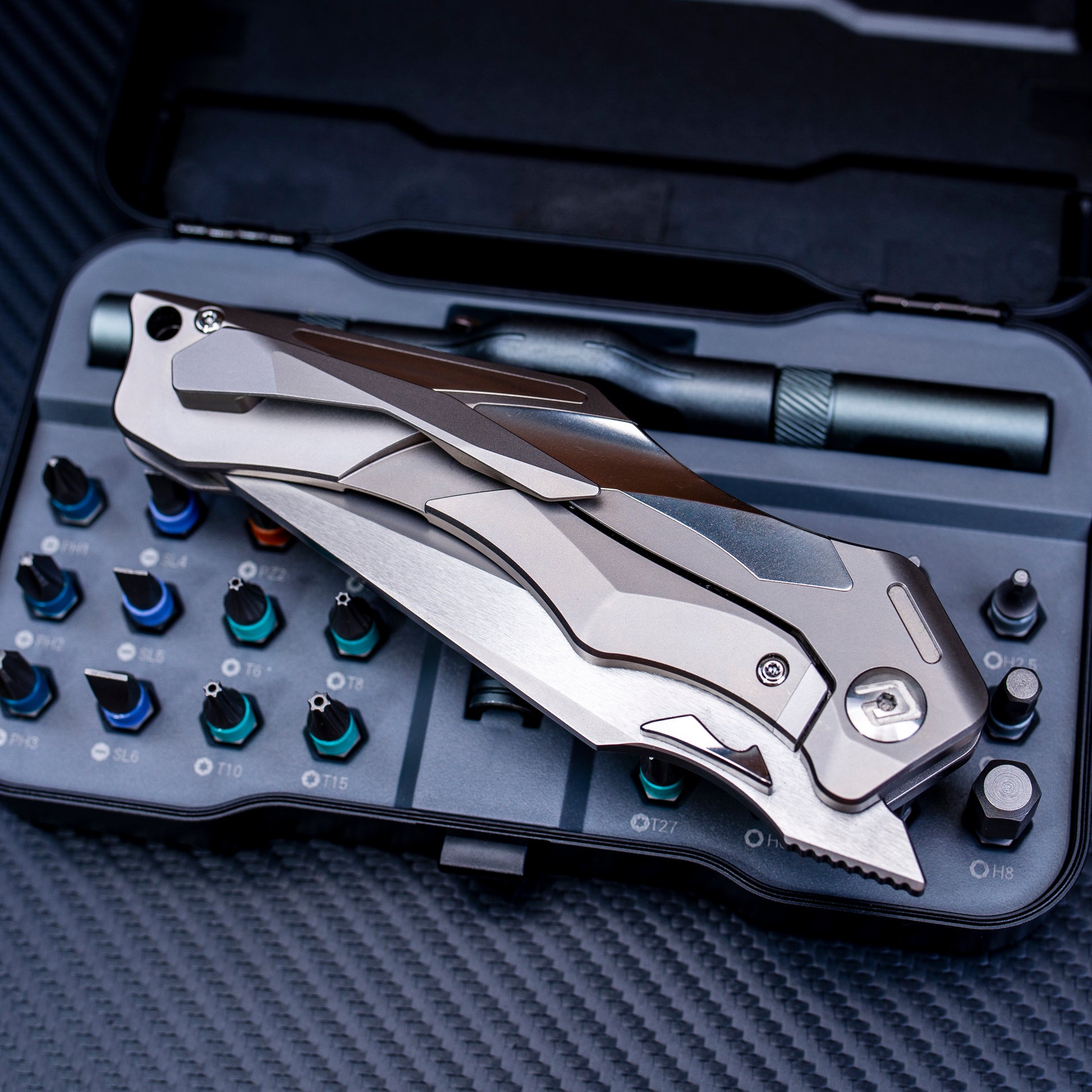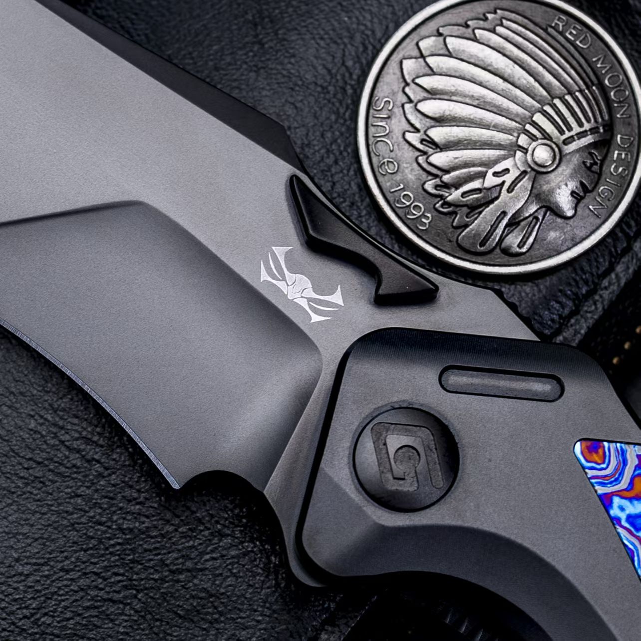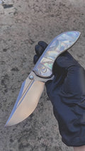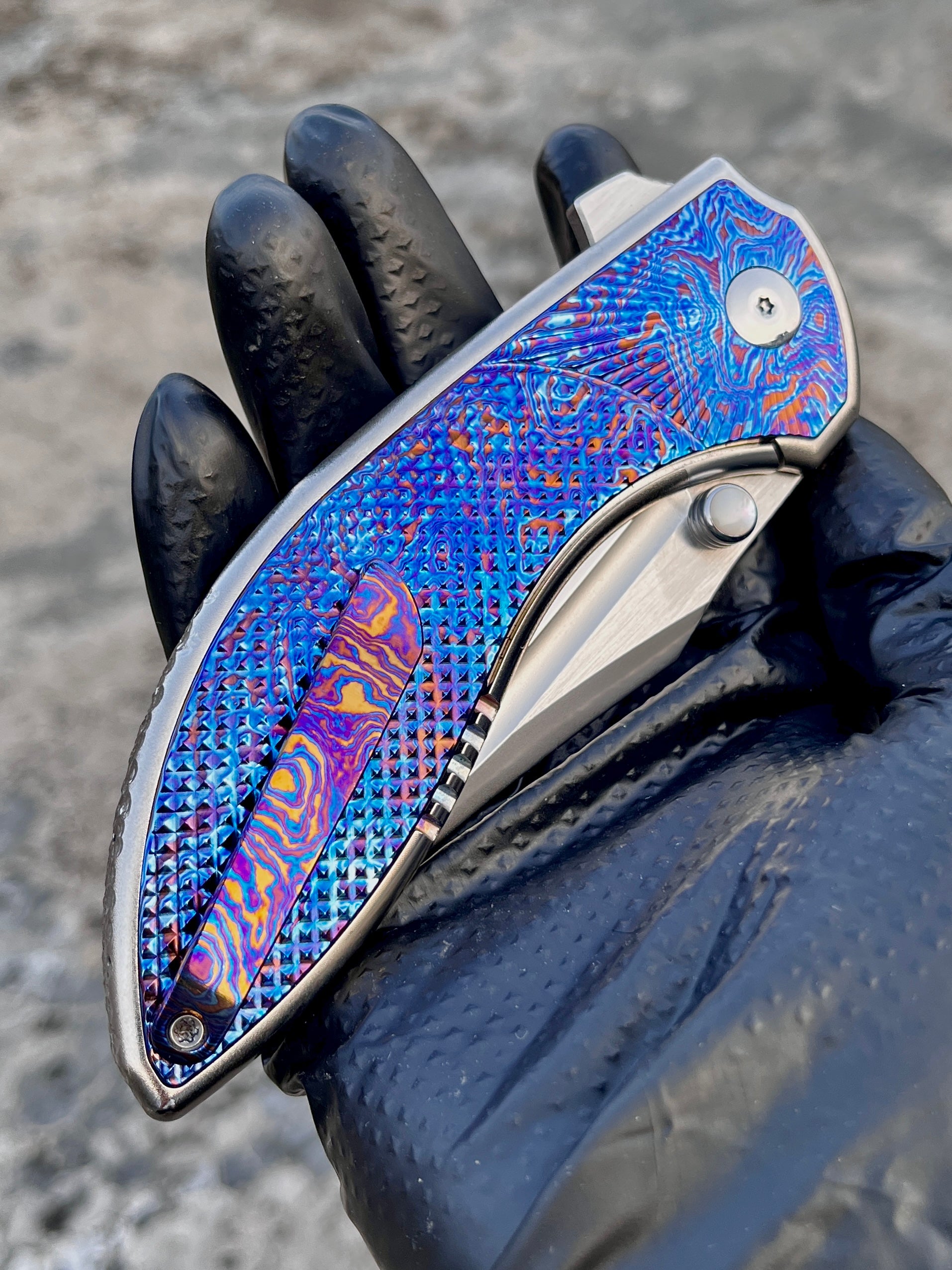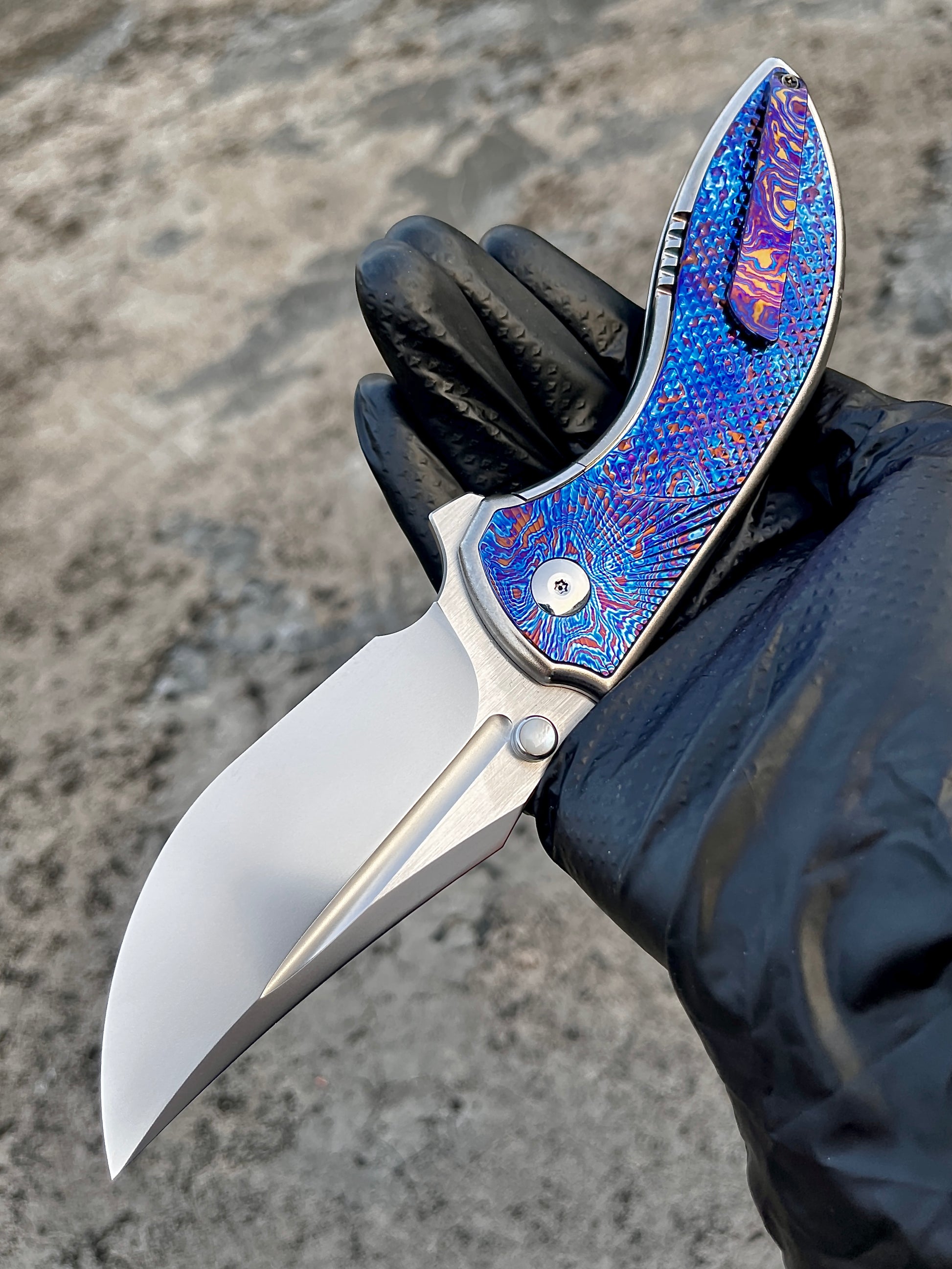 Integral titanium handle inlaid with three materials: zirconium, zirconium Damascus, and deep-sea mother of pearl. M390 blade, overall length 22.5 cm, blade thickness 4 mm.