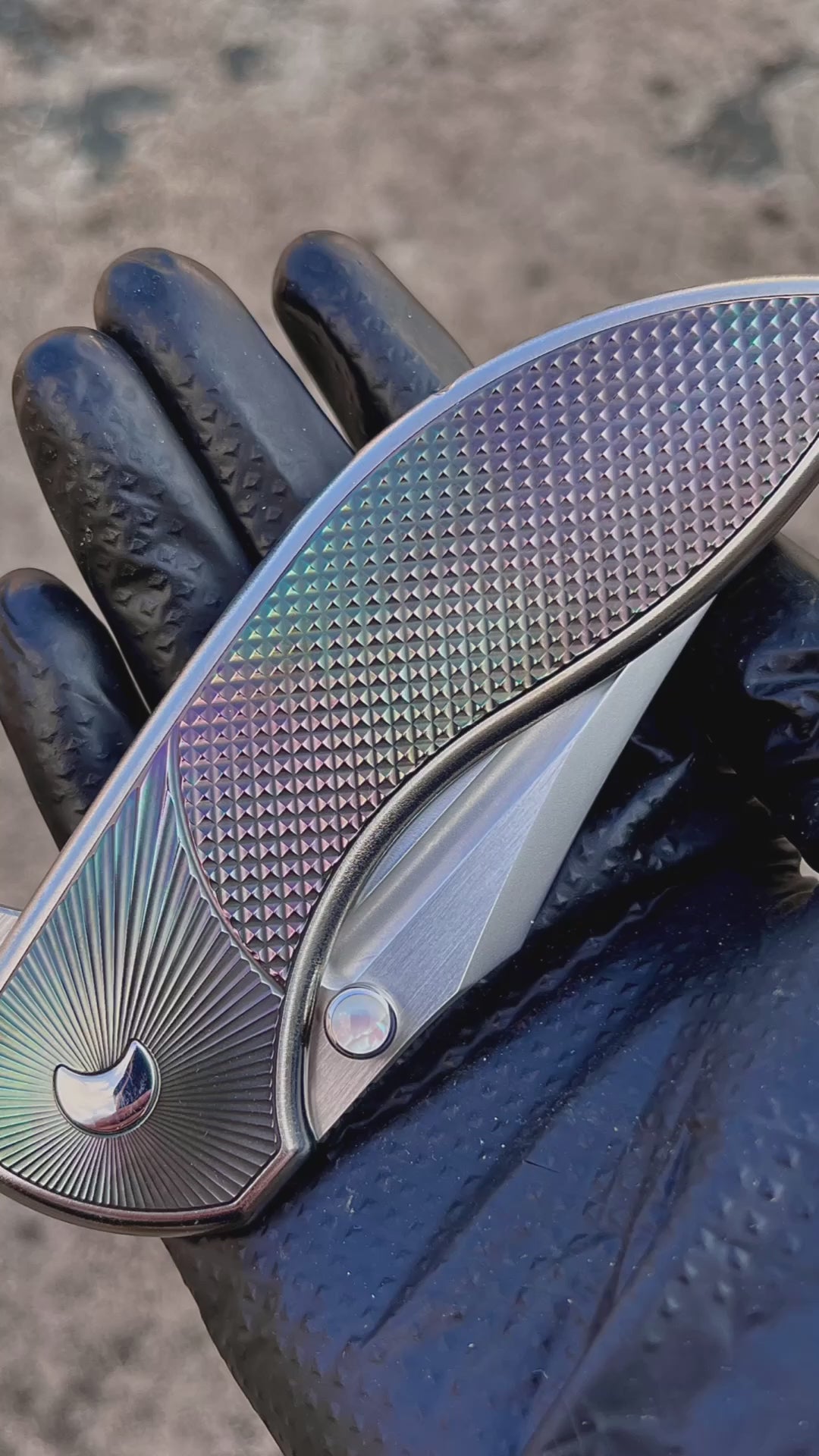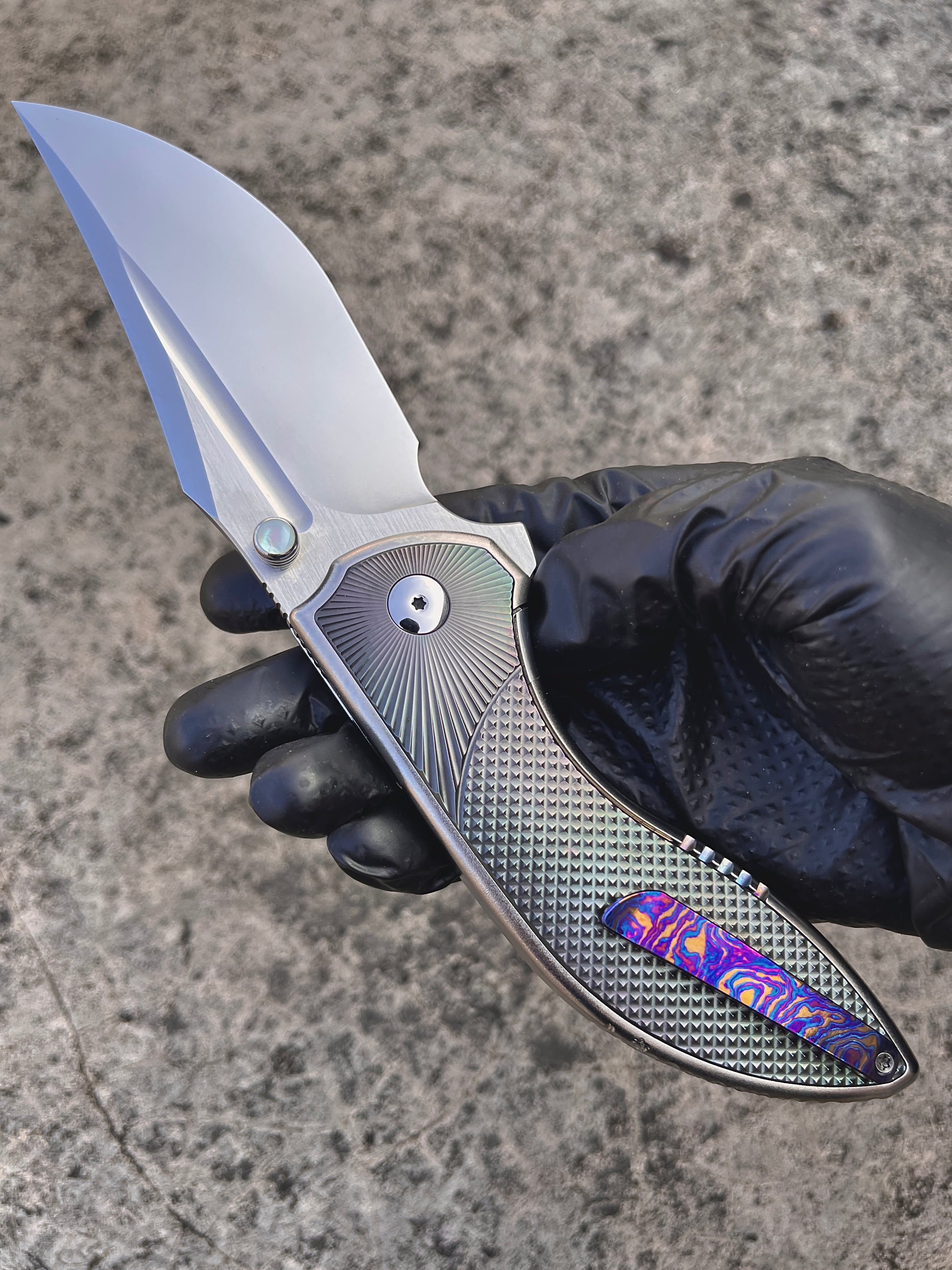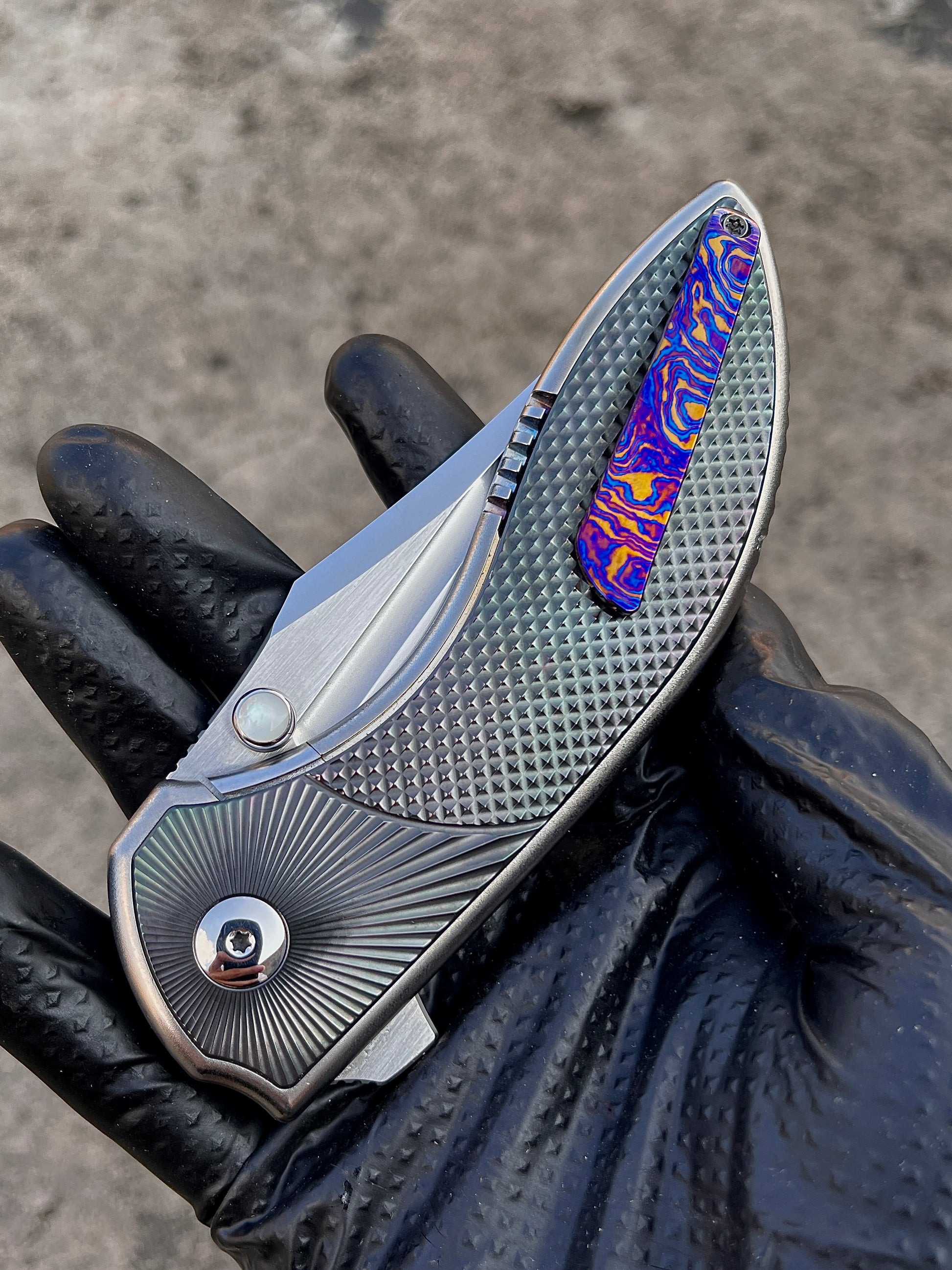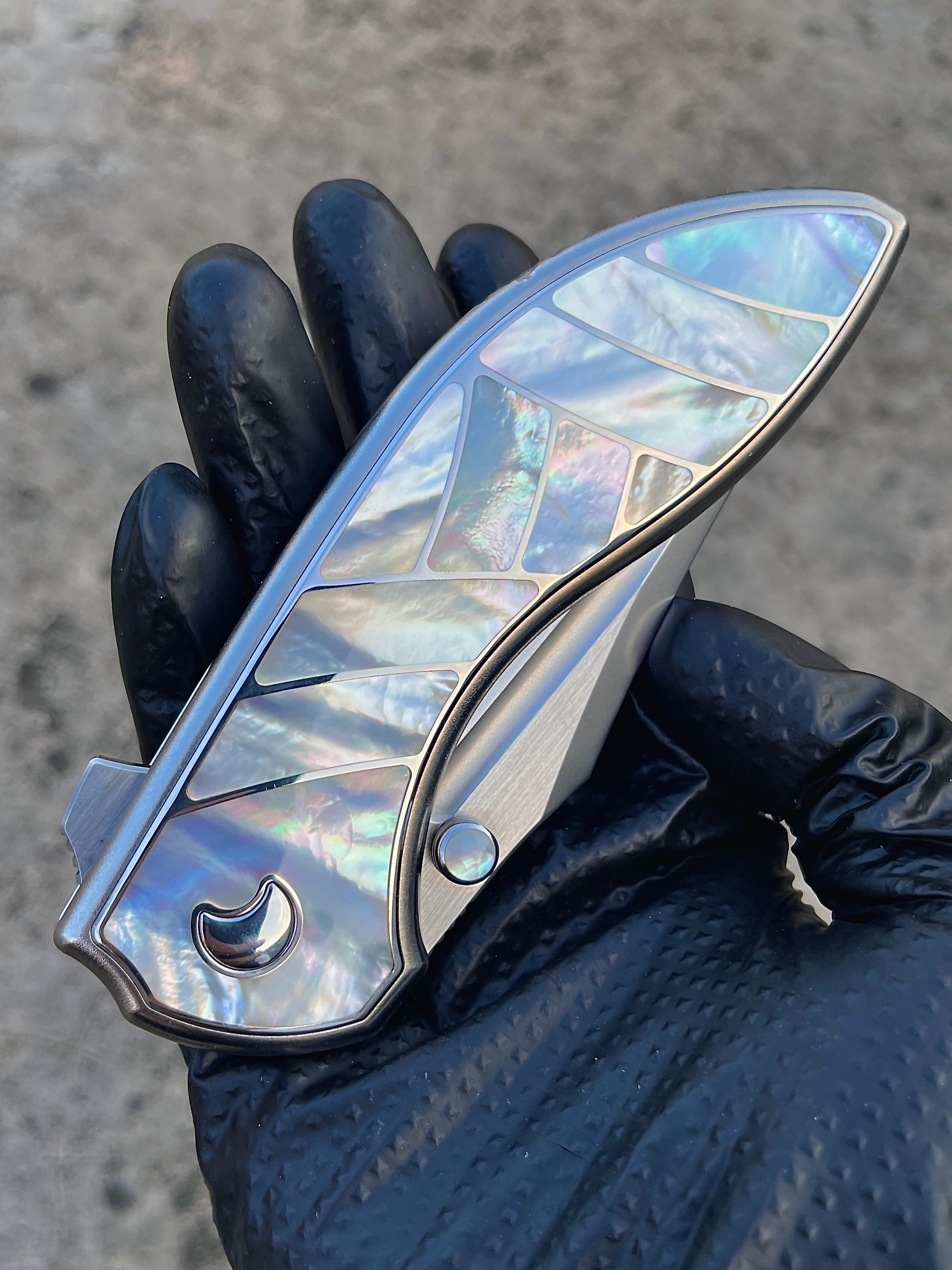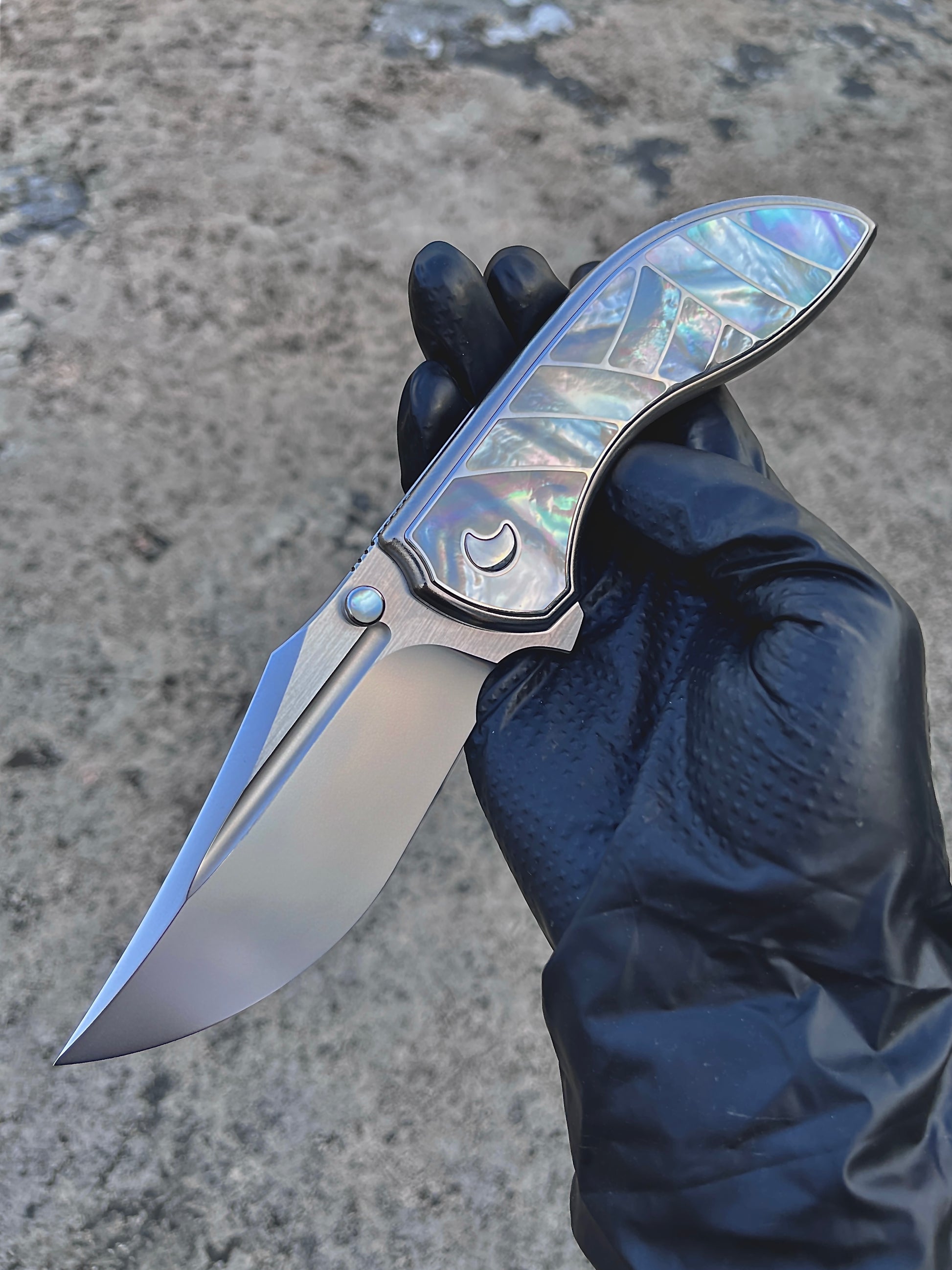 Integral titanium handle inlaid with three materials: zirconium, zirconium Damascus, and deep-sea mother of pearl. M390 blade, overall length 22.5 cm, blade thickness 4 mm.
