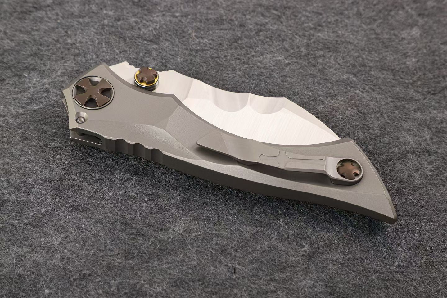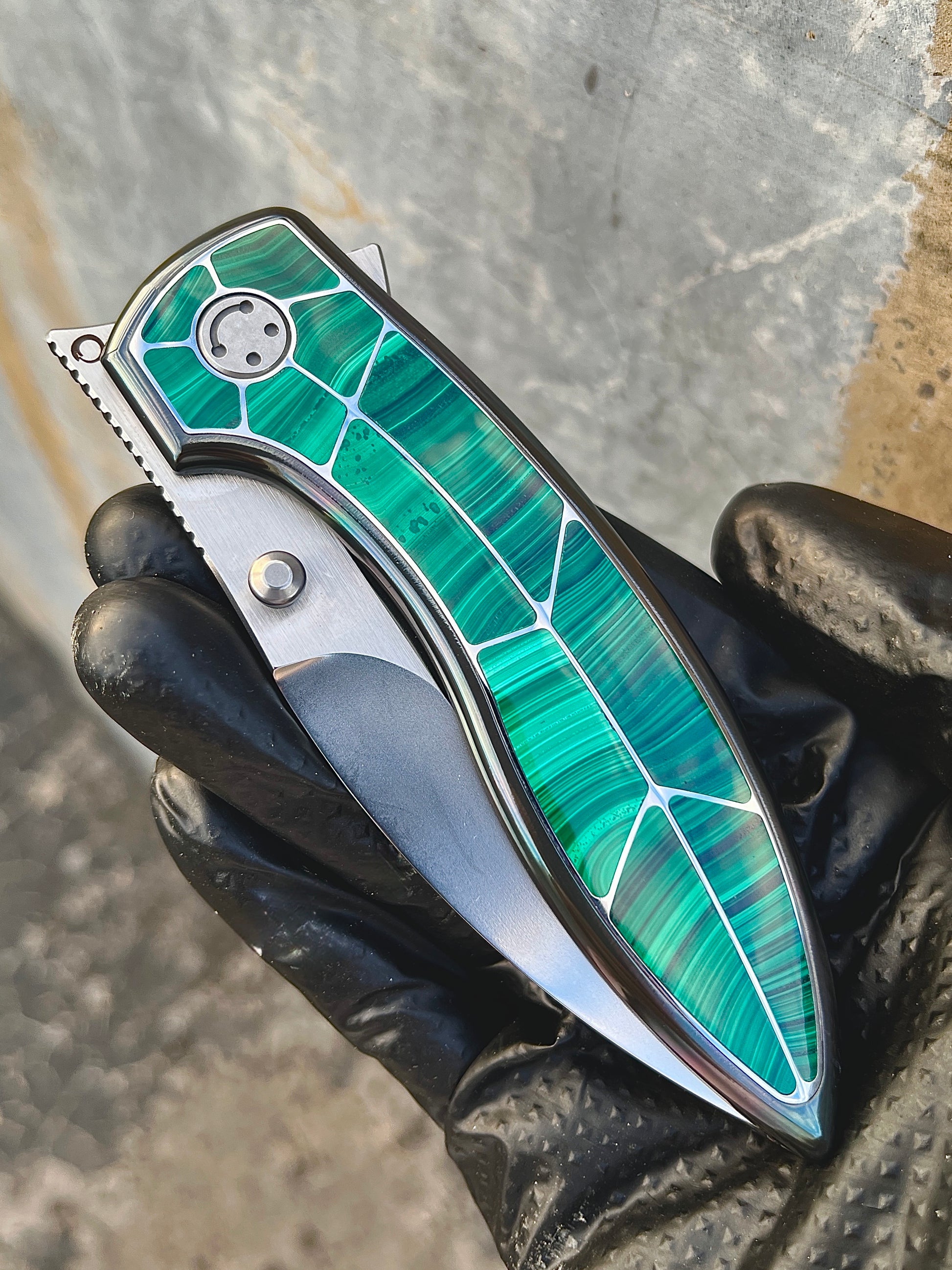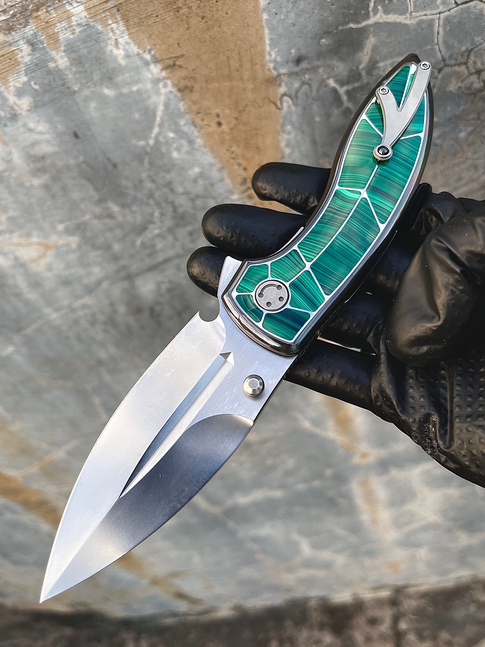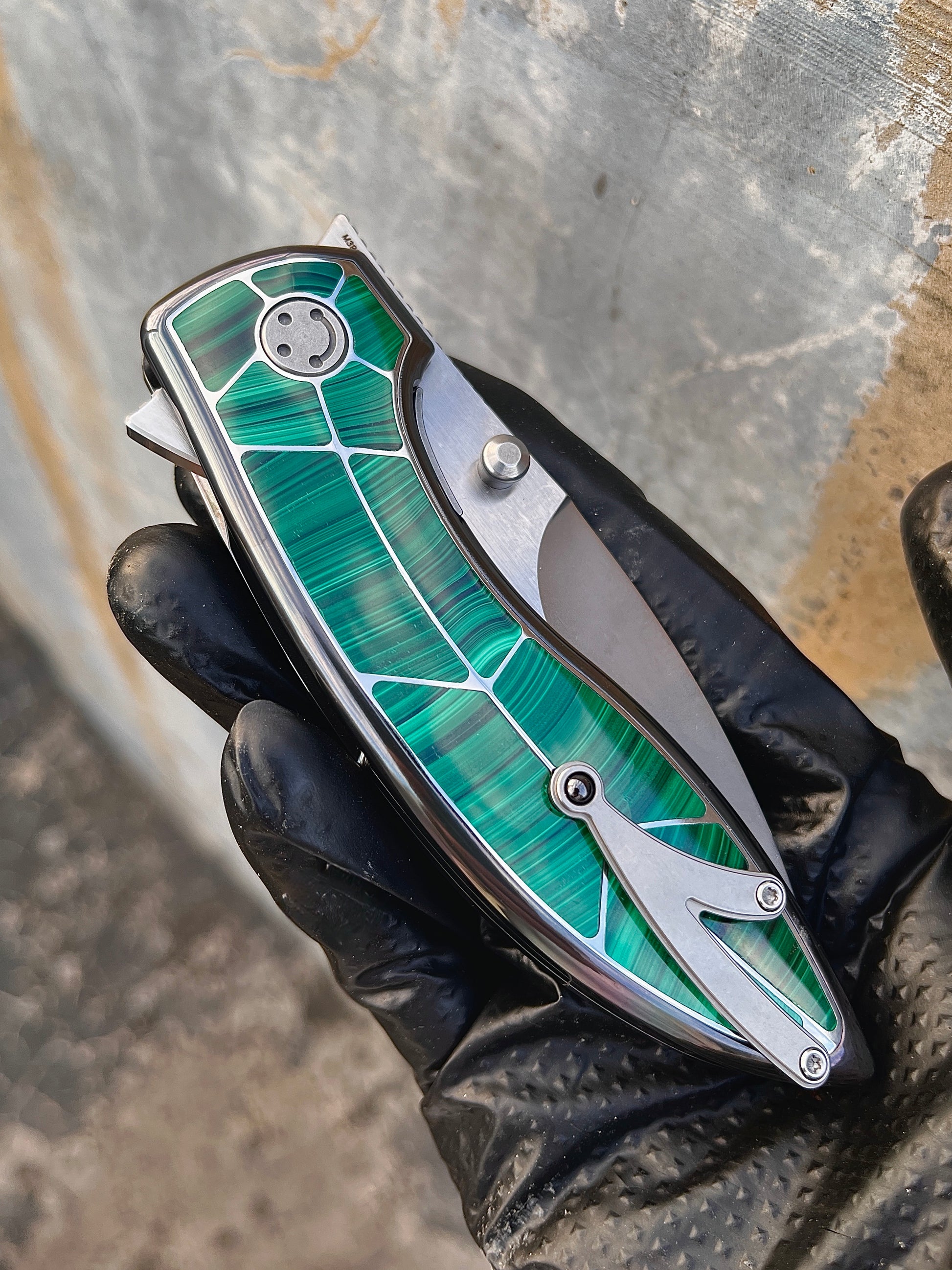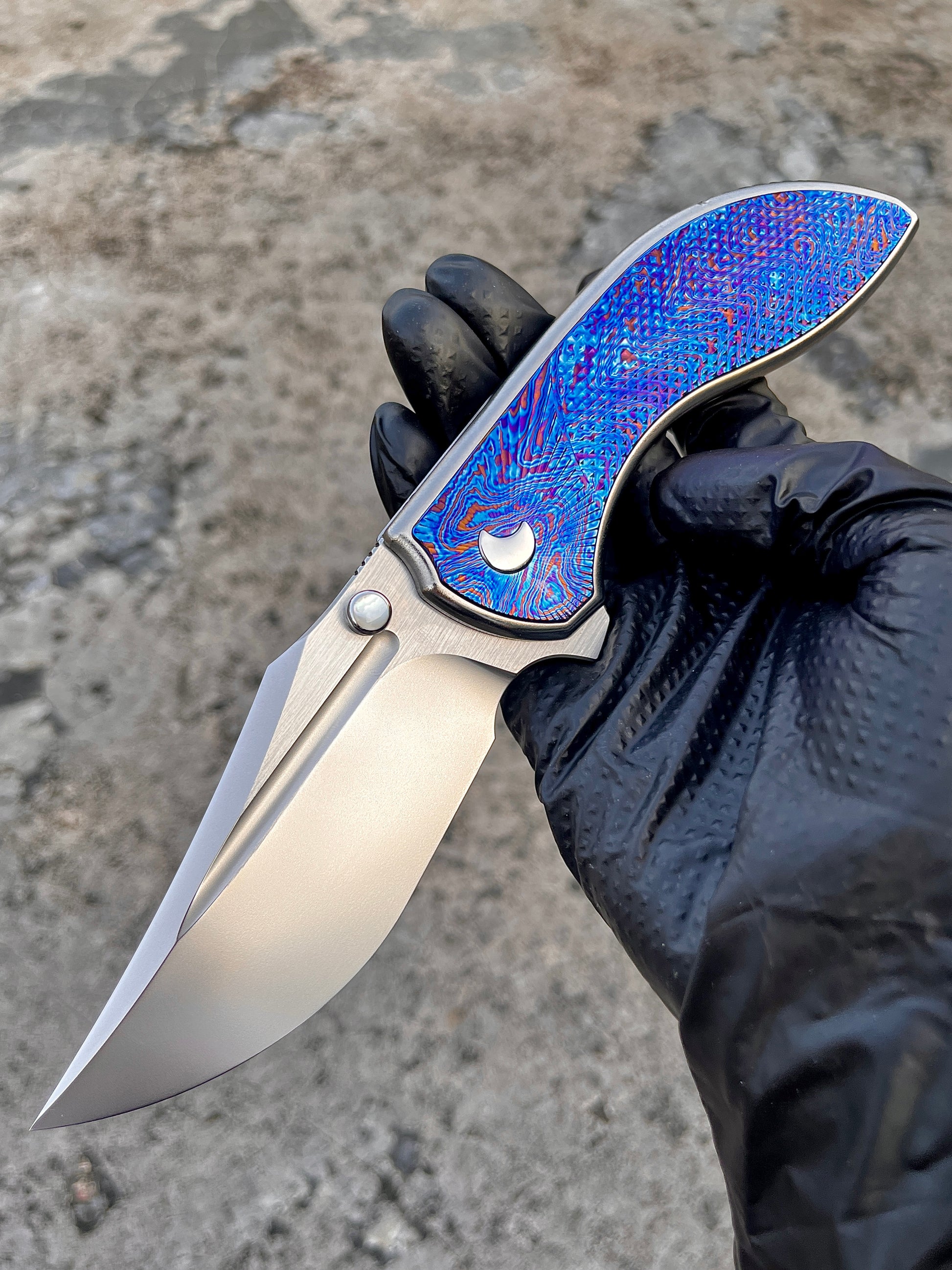 Integral titanium handle inlaid with three materials: zirconium, zirconium Damascus, and deep-sea mother of pearl. M390 blade, overall length 22.5 cm, blade thickness 4 mm.