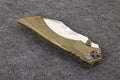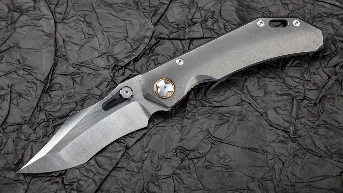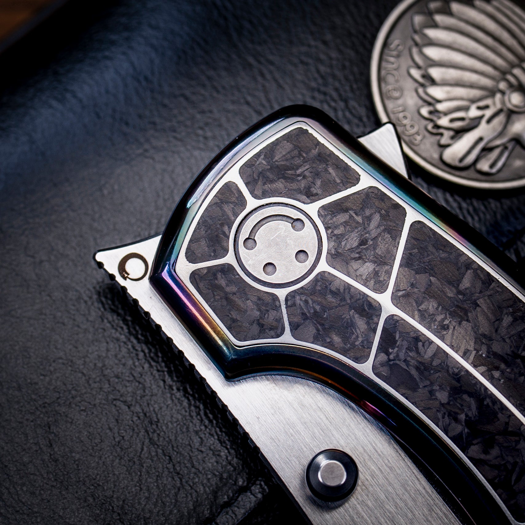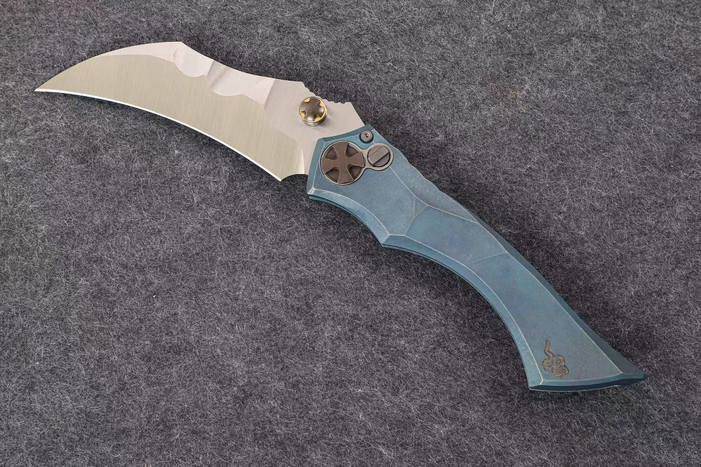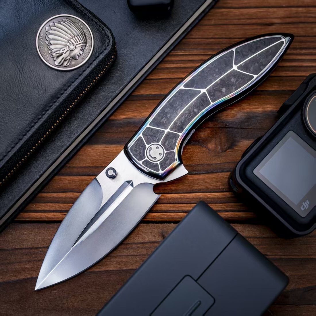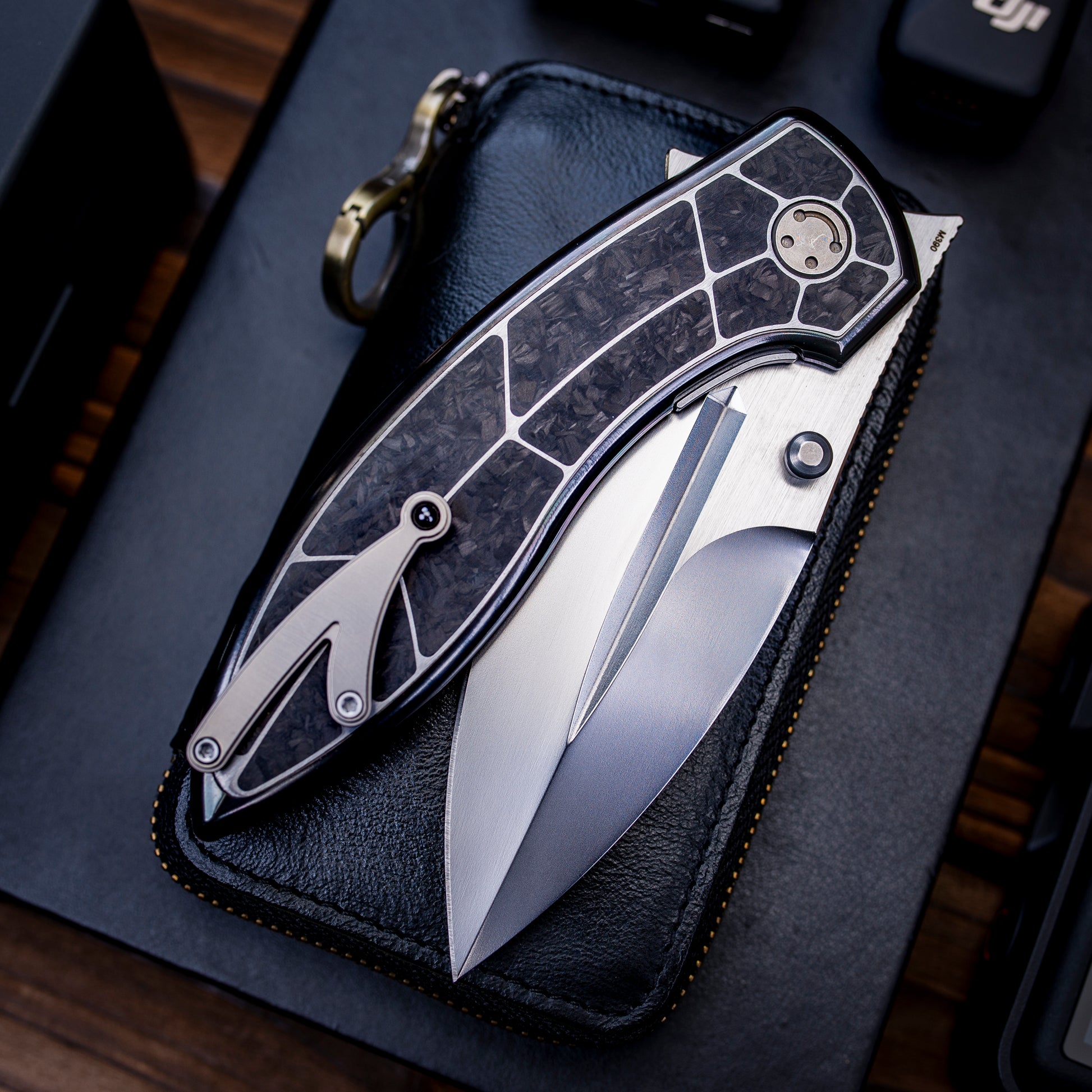 Integral titanium handle inlaid with three materials: zirconium, zirconium Damascus, and deep-sea mother of pearl. M390 blade, overall length 22.5 cm, blade thickness 4 mm.