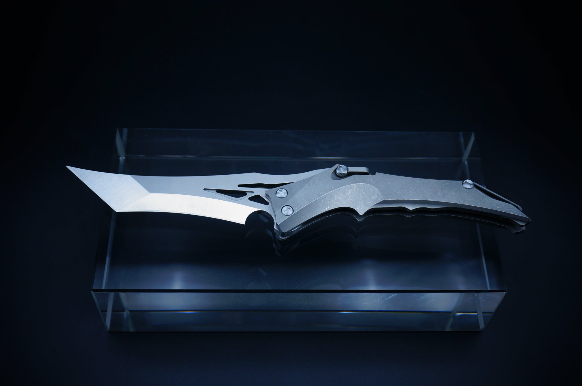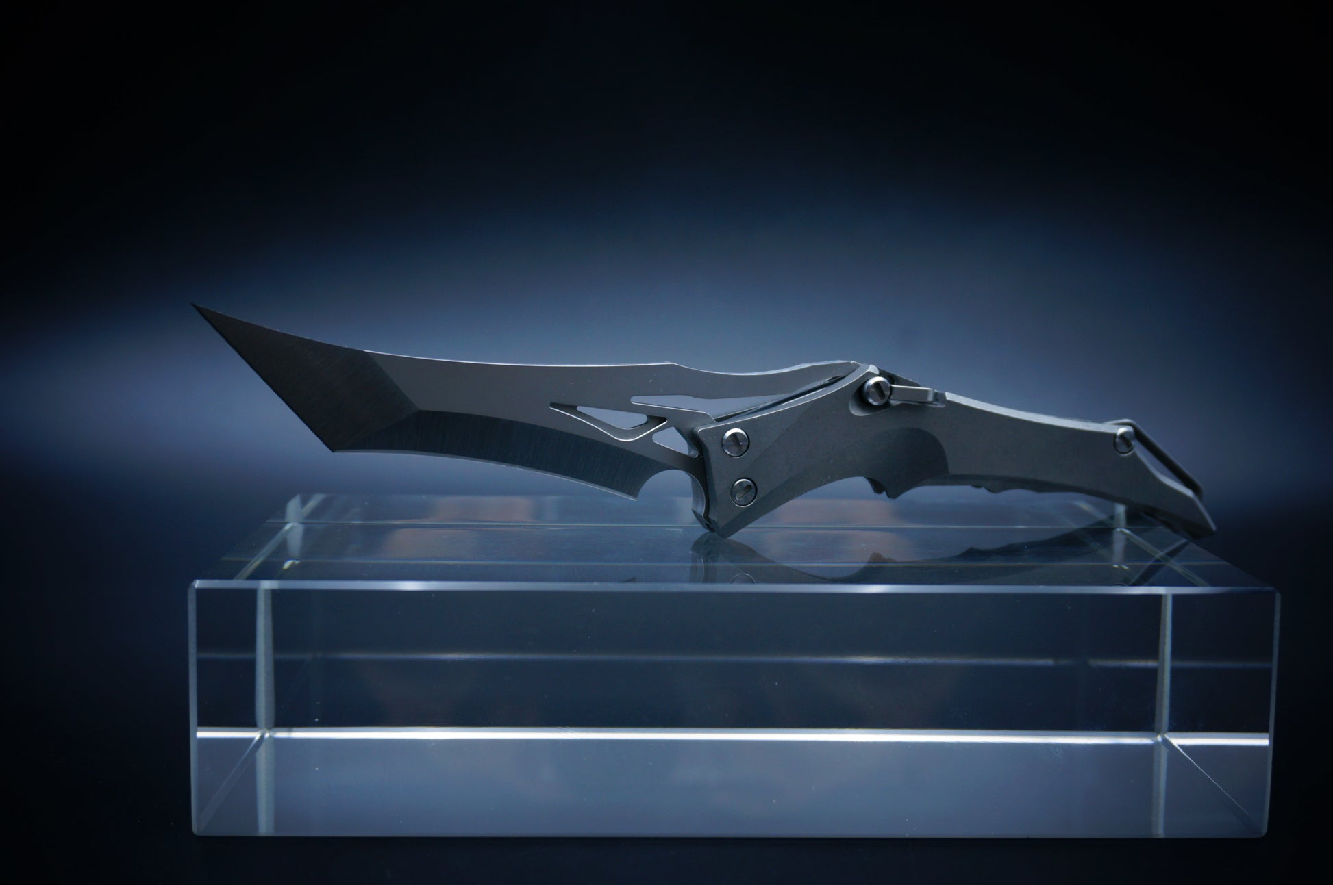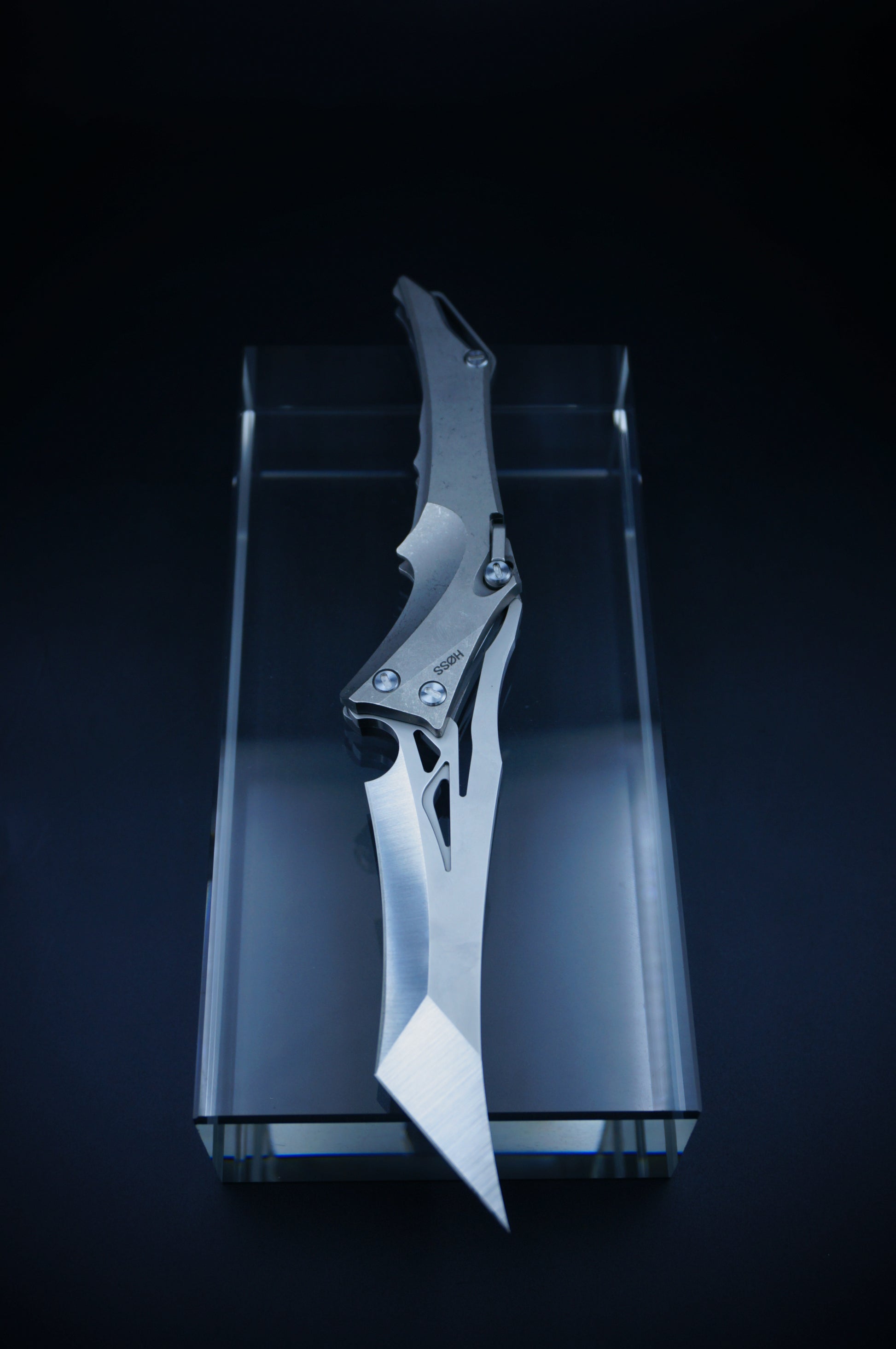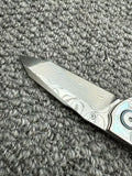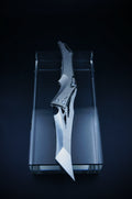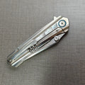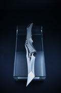 Ergonomic, bionic-inspired design—when closed, the knife resembles a dragon’s head. The blade features a two-stage grind, long and razor-sharp. The locking mechanism is a ring-style system, similar in function to a back lock.