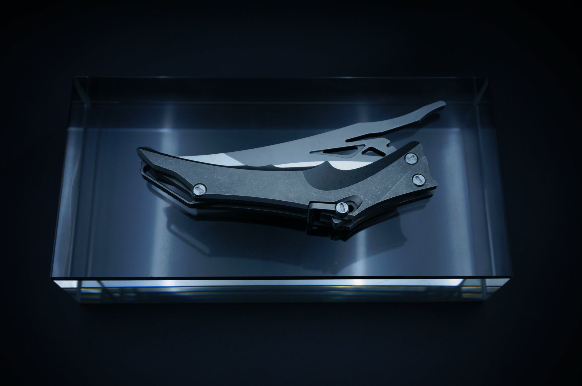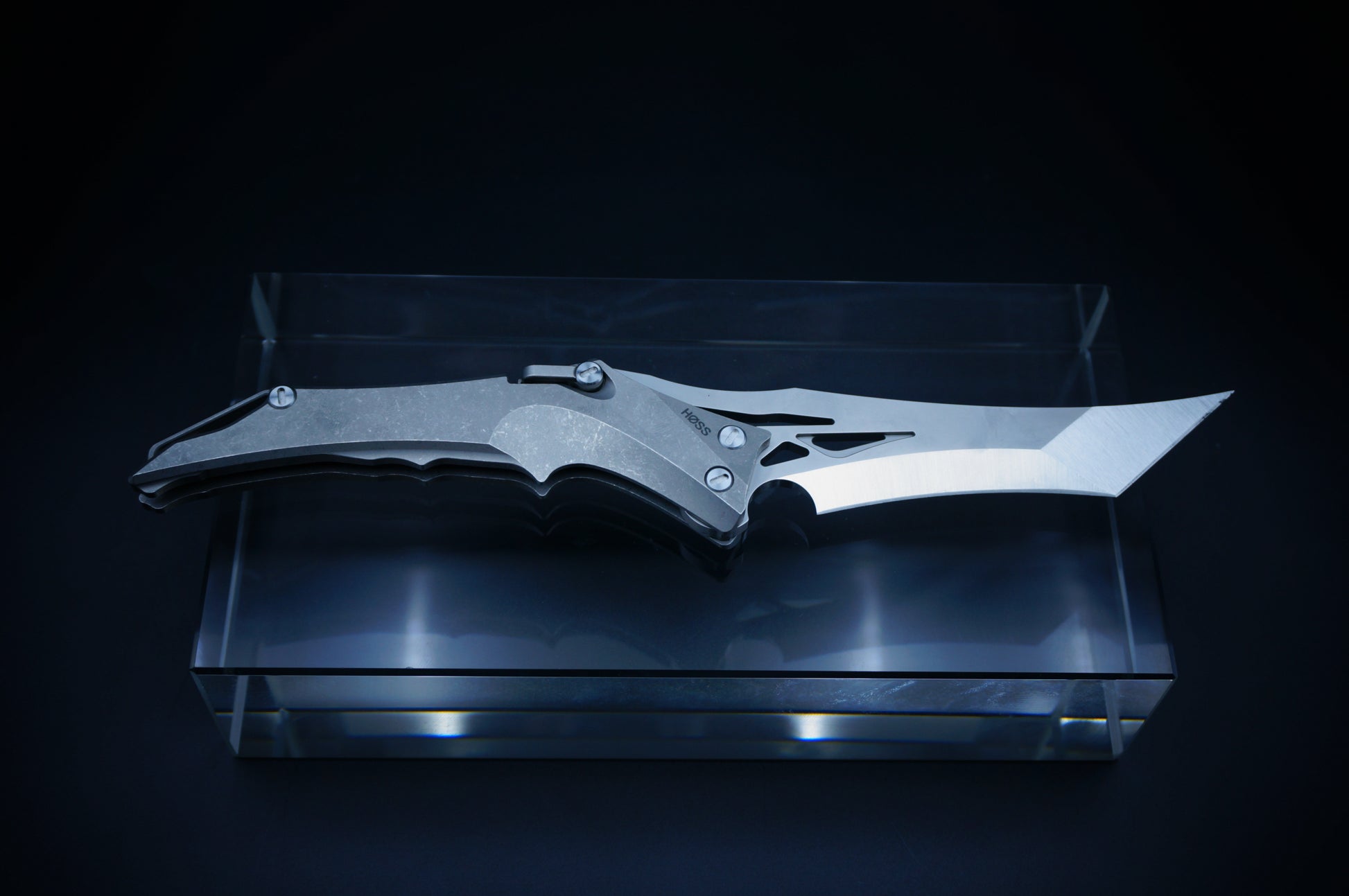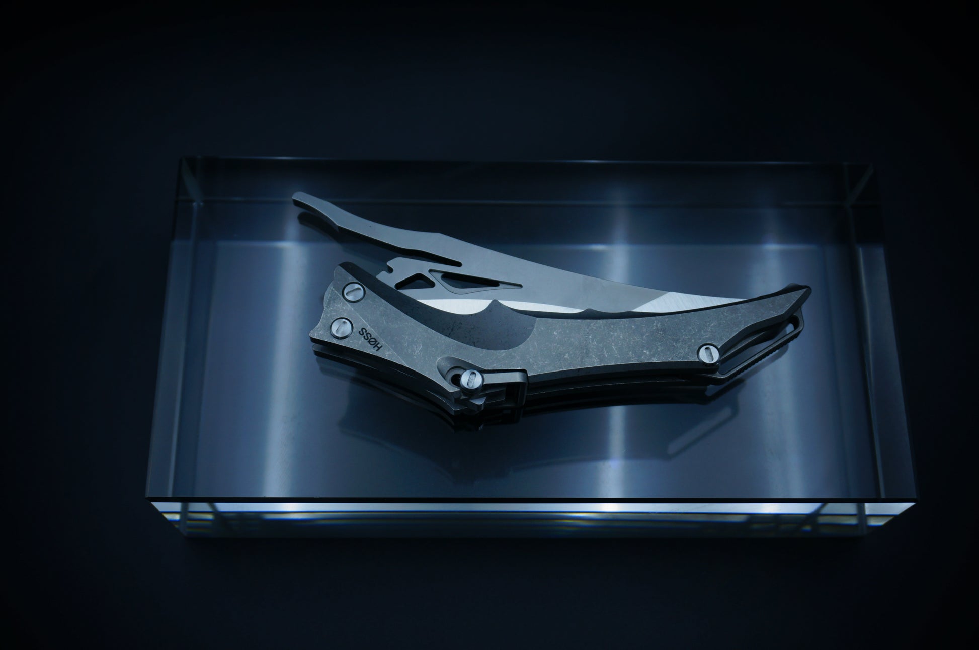 Ergonomic, bionic-inspired design—when closed, the knife resembles a dragon’s head. The blade features a two-stage grind, long and razor-sharp. The locking mechanism is a ring-style system, similar in function to a back lock.