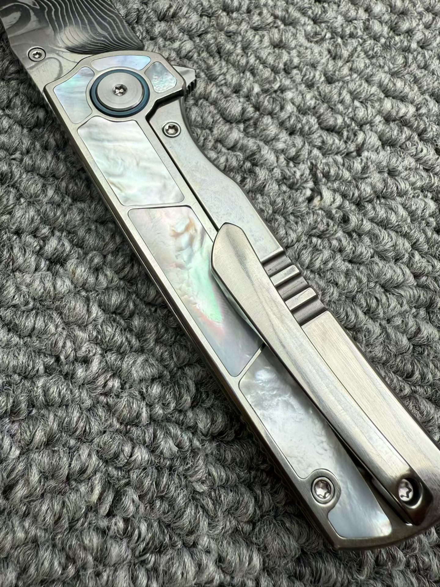 Handle Color/Finish: Polished titanium with pearl inlay