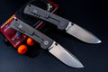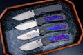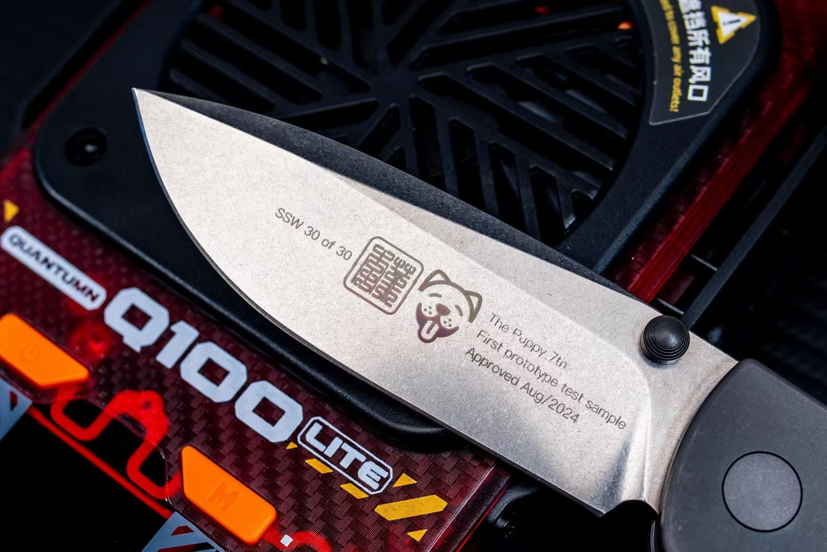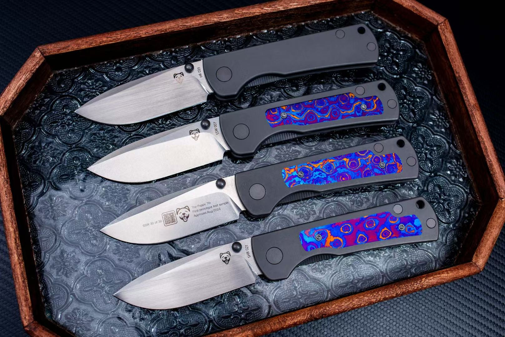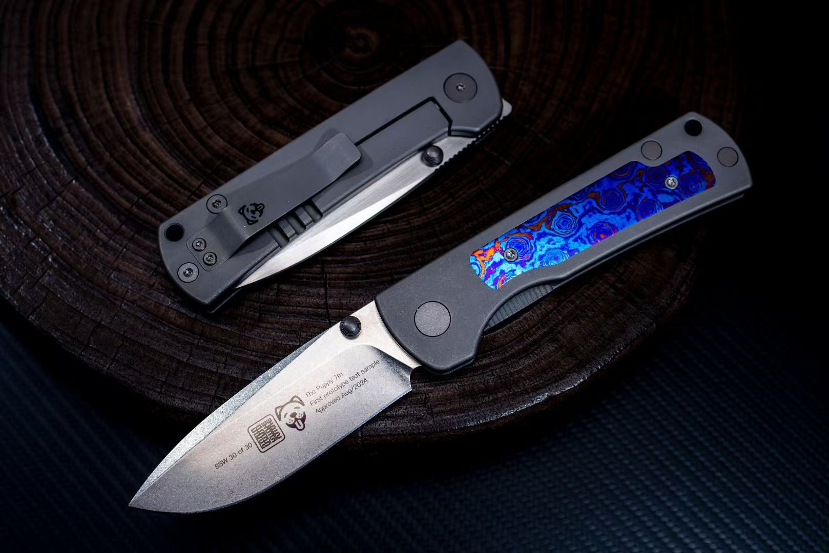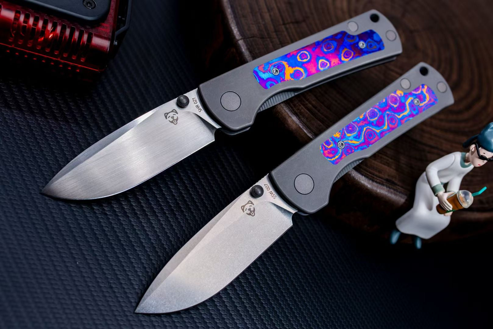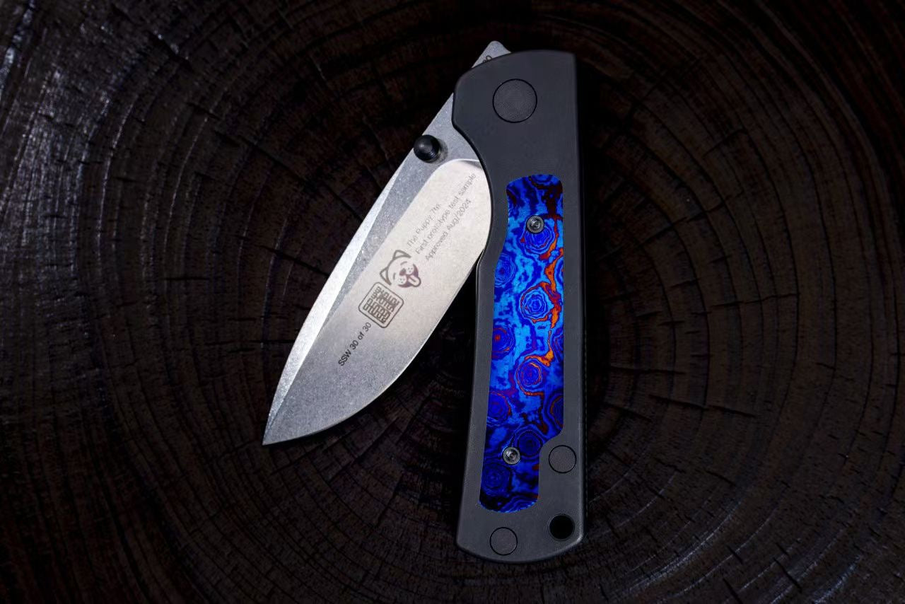 Version 1: The blade is Bohler M390 with a bright stonewashed finish, and the handle is aged gray titanium alloy inlaid with titanium Damascus.
