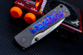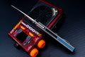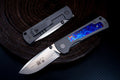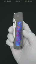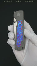 Version 2: The blade is Bohler M390 with a handcrafted horizontal satin finish, and the handle is aged gray titanium alloy inlaid with titanium Damascus.